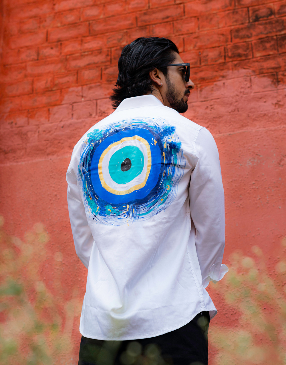 Protect your aura in style with this hand-painted Evil Eye white shirt from Nautanki. Crafted from premium cotton for ultimate comfort and breathability, this designer shirt features a striking Evil Eye artwork on the back – a modern twist on an ancient symbol of protection. Perfect for casual wear, art lovers, or as a statement piece for your wardrobe. Pair it with jeans or chinos for an effortlessly cool and artistic vibe.