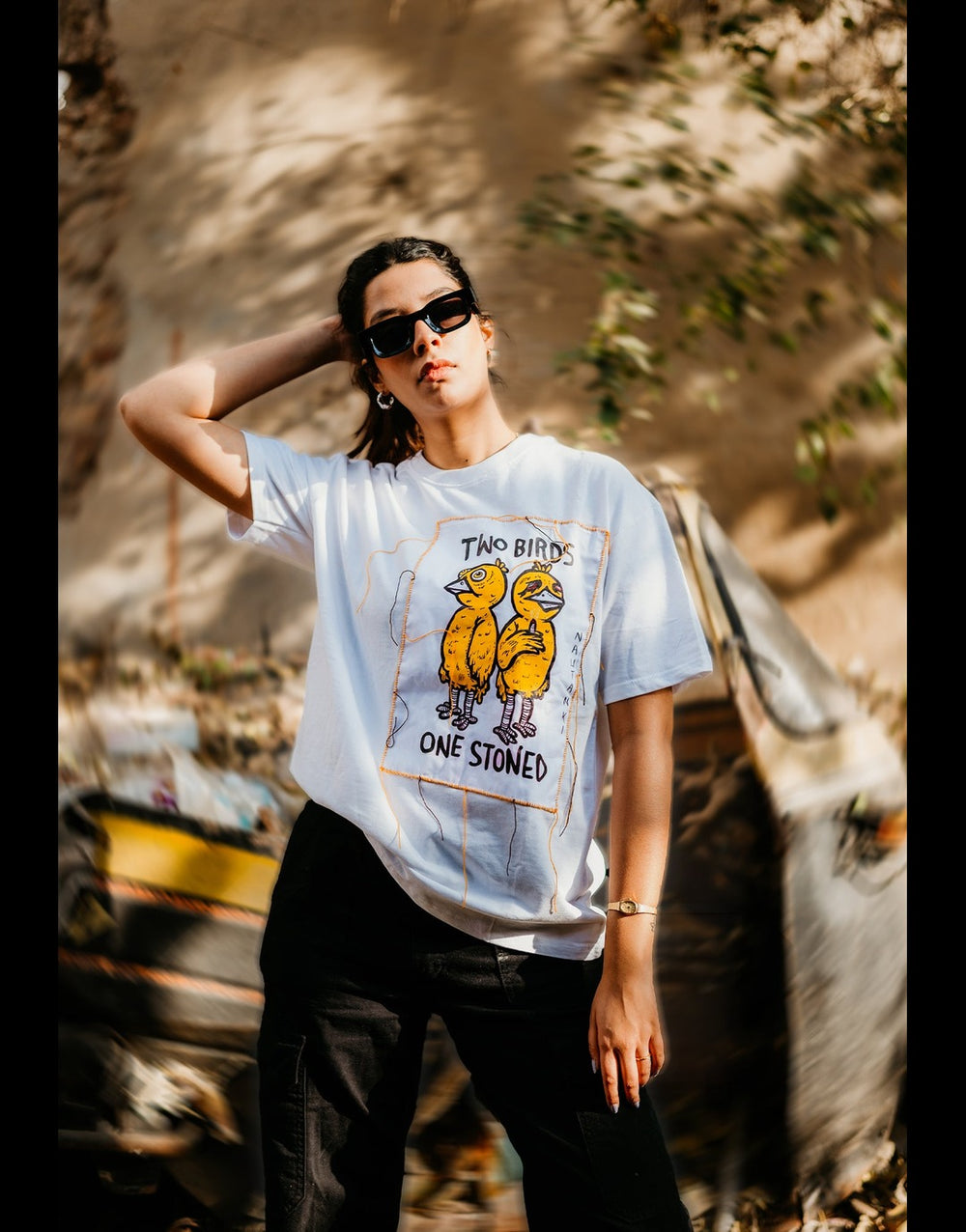 Hand-painted and hand-stitched, the *Quirky Birds Tee* by NAUtanki showcases a fun bird graphic with a witty caption. This premium shirt is all about spreading good vibes in style. Perfect for those who love a playful, standout look.
